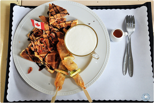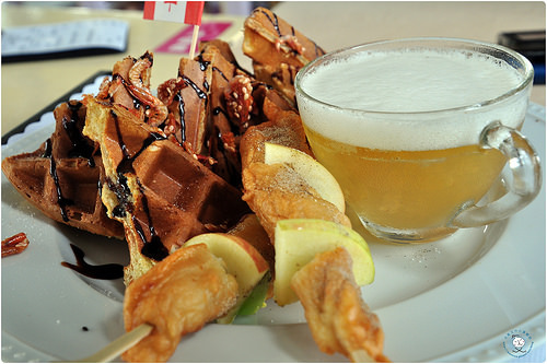 櫻花蝦啤酒凍鬆餅,又鹹又甜,有櫻花蝦.巧克力醬再加上淋上啤酒和蜂蜜的蜂蜜檸檬果凍,真的很特別的味道!