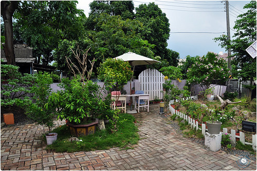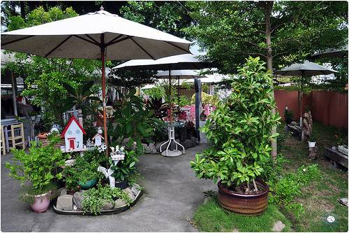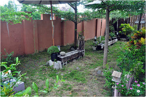 餐廳庭院內到處擺滿了花草盆栽,綠意盎然