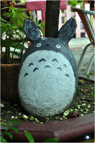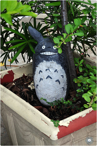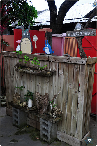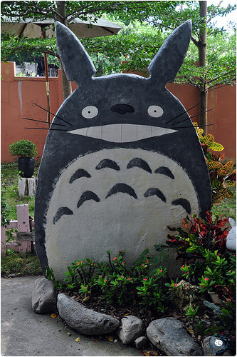 不大的庭園裡,用石頭做成許多龍貓的造景,還有一些裝置藝術,但位置不大,餐點也要等待一些時間...