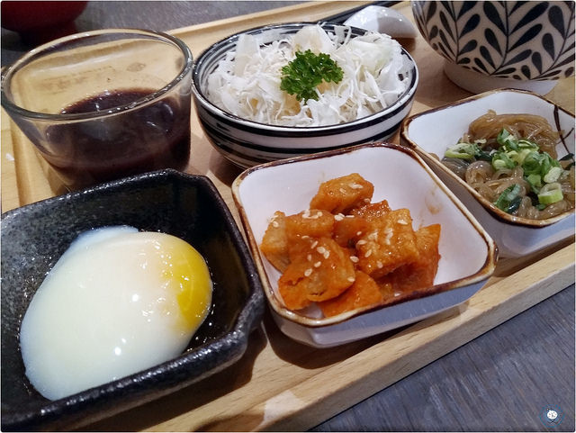 附小菜兩樣、生菜、溏心蛋、甜點、飲品。